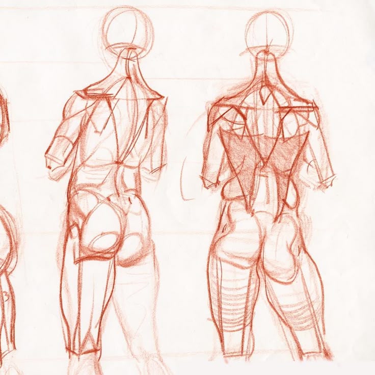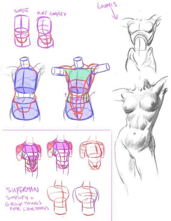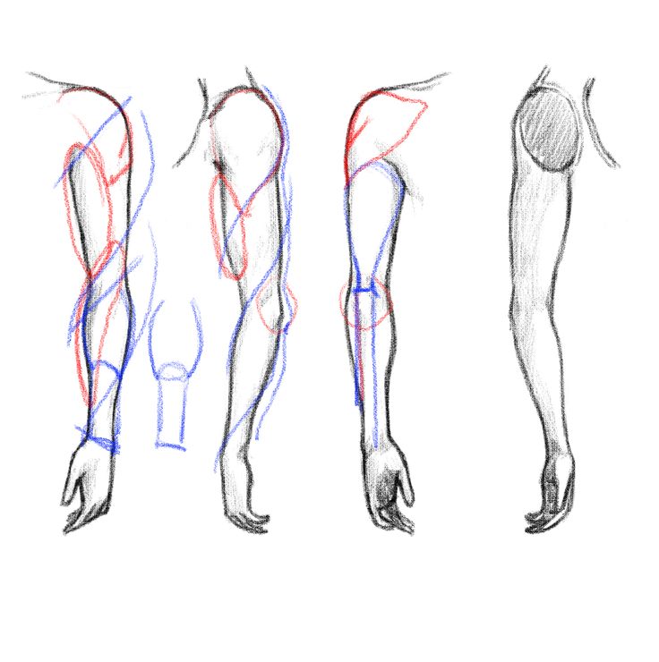 Используйте книгу по анатомии, чтобы понять, что находится под поверхностью, но подумайте о каждой мышце в 3D. Не рисуйте мышцы в виде серии линий. Нарисуйте их в виде скульптурных сфер, ящиков и цилиндров.