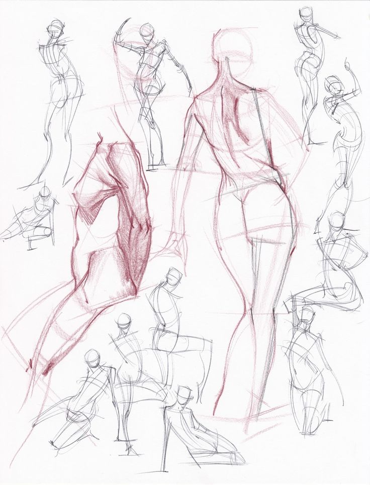 Анатомия и пропорция играют вспомогательную роль в изображении телодвижений. Главное — передать динамику, движение, позу фигуры, а детали второстепенны. Каждый шаг вашего рисунка должен состоять в том, чтобы создать единую фигуру, которая имеет энергию, даже если это требует изменения пропорций или анатомии.