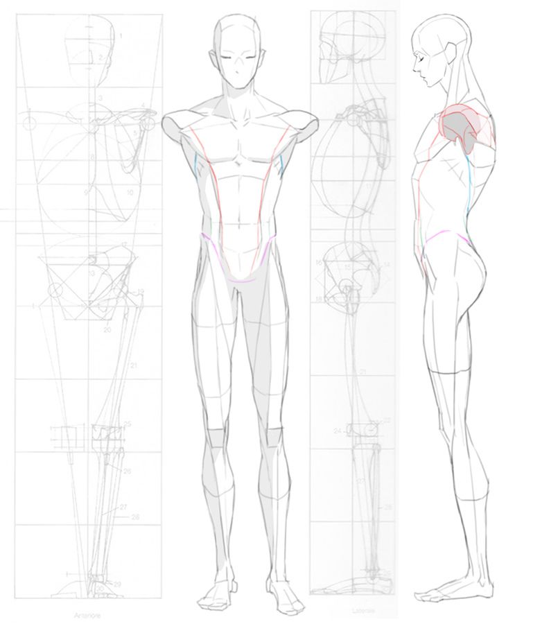 Анатомия человека для рисования — отличия в фигурах мужчины и женщиныОсновное различие заключается в соотношении ширины плеч и бедер. У женщин тазовая кость шире, а талия – уже. У представителей сильного пола самая широкая часть – плечи, а вот талия и бедра имеют почти одинаковую толщину. По форме женский силуэт похож на песочные часы, тогда как мужской – на трапецию.