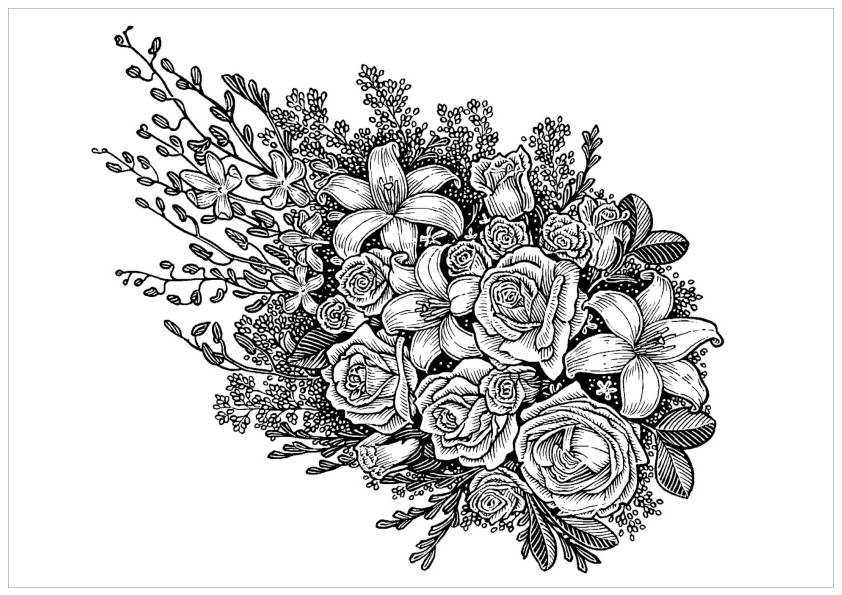 Рисунок выполняется карандашом, по желанию художника букет можно раскрасить или оставить в черно-белой гамме.