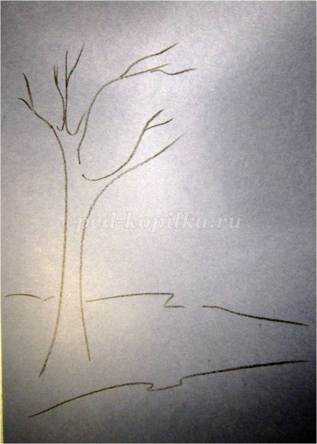 3. На первом плане нарисуем большое дерево с небольшим количеством листвы.