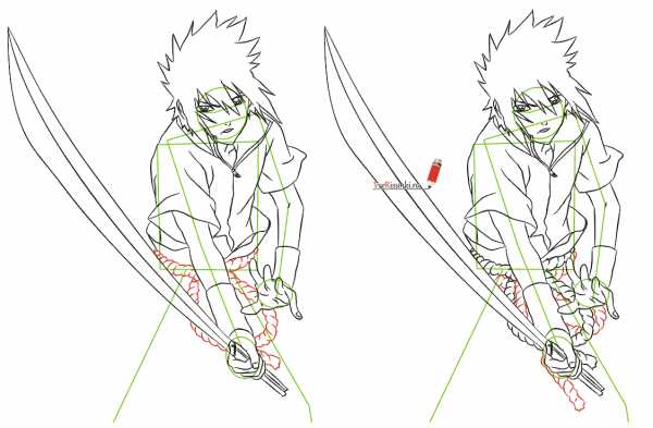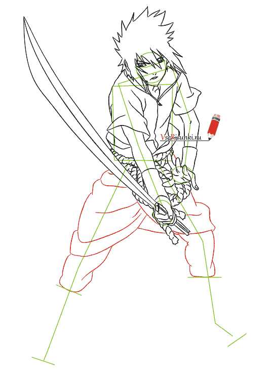 Этап 6. В правой руке изобразим оружие Саске — огромный, чуть искривленный меч, который он крепко держит, зажав в кулак.