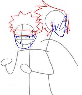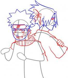 Шаг 3. Здесь вы будете рисовать в полный контур Наруто прическу, а потом так же за Саске. После этого, нарисуйте в голове протекторов, а затем Саске на ухо.