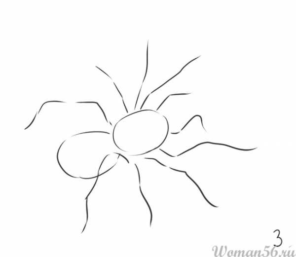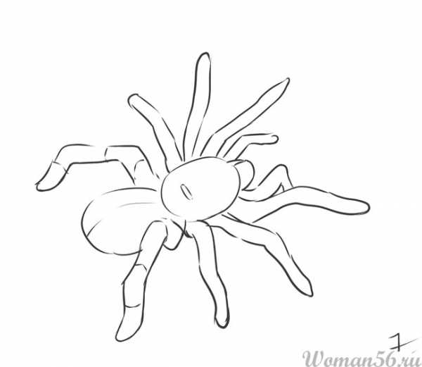 В очередном уроке по рисованию карандашом мы хотели бы показать при помощи поэтапных подсказок как нарисовать паука поэтапно. На первый взгляд кажется, что рисунок паука достаточно сложный, однако, когда вы начнете рисовать, поймете, что ничего особо сложного в этом рисунке вовсе нет. Самое главное, чтобы ножки были прорисованы «члениками» — как у настоящего паука, при этом его лапки должны быть весьма тонкими и длинными. Итак, приступим к рисованию. Начинаем мы с тела насекомого — рисуем две фигуры, напоминающие овал посередине листа. Далее необходимо сделать разметку будущих лап паука. Их у него восемь.