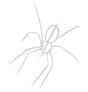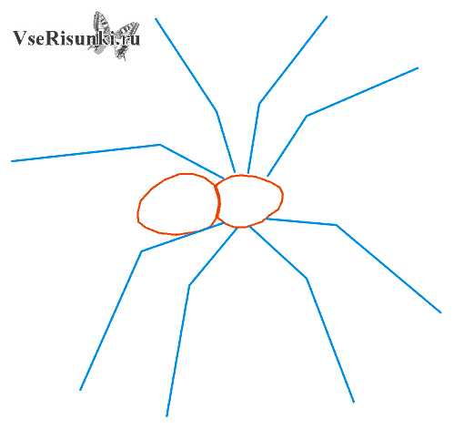 Шаг 3. В данном этапе изобразим вспомогательные линии для дальнейшего рисования ног и передних клыков паука.