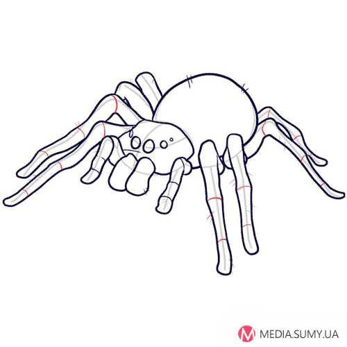 Шаг 10. Теперь доработаем внешний вид ног насекомого, нарисовав горизонтальные линии на его лапах, выделим их составные части. И в завершение данного этапа нарисуем на лапках паука волоски для создания волосяного покрова насекомого.