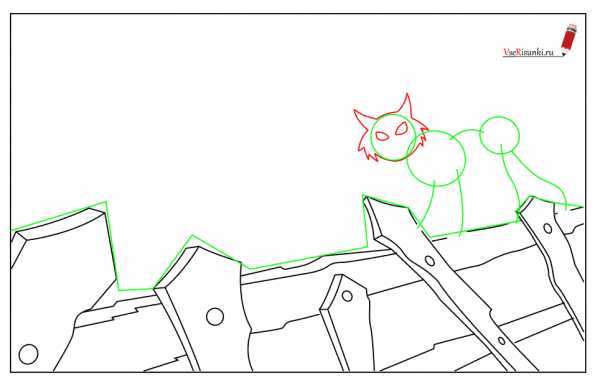 Этап 1. На картинке будет изображен дом, забор, кот. Все это на фоне ночного неба. Вначале рисуем вспомогательные линии забора. Это кривые, соединенные между собой под разными углами. На правом краю забора будет изображен кот. Его тело обозначаем тремя кругами, которые соединяются кривой туловища. От кругов отхоят линии ножек (лапок).