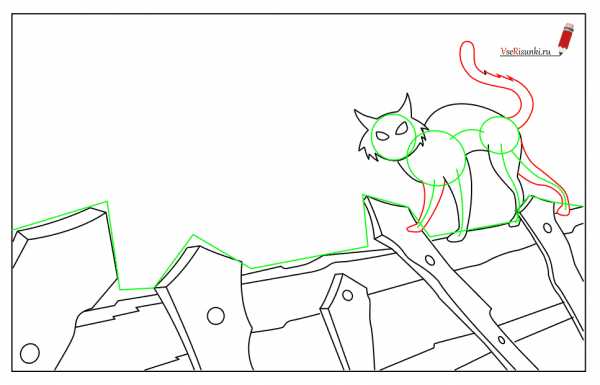 Этап 5. Обрисуем туловище кота. Все это делается плавными линиями, спину рисуем выгнутой кверху, живот — короткой вогнутой чертой. Линии лапок обводим плавно, придавая контур конечностей.