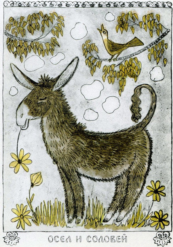 «Осел и соловей». Рисунок М. М. Гужавина |