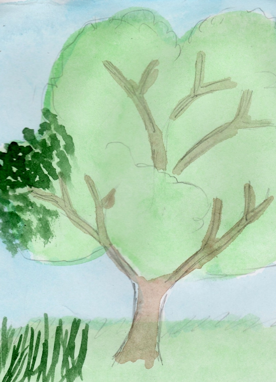Теперь вы можете либо подождать, пока высохнет предыдущий слой, либо, если хотите, продолжите смешивание и добавьте слой более легкой зелени. Это основная часть цвета дерева. Вы также можете добавить некоторые вариации цвета к стволу дерева — добавить текстуру, тени и многое другое. Здесь ваше дерево начнет оживать.