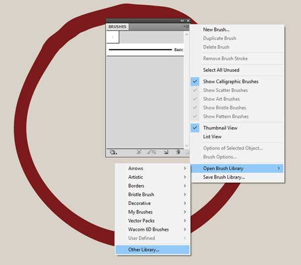 Создайте новый слой под слоем тарелки. Именно в нем мы собираемся рисовать наши спагетти. Откройте палитру Brush/Кисть (F5). Выберите в выпадающем меню Open Brush Library > Other Library/Открыть библиотеку кистей>Другая библиотека. Выберите файл ваших кистей.