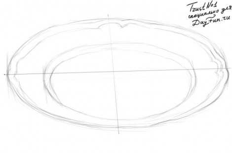 Шаг первый. Изобразим овальную форму. Шаг второй. В ней сделаем такую же, только поменьше. Шаг третий. Начнем прорисовку узора тарелки. Шаг четвертый. Заштрихуем сначала внутреннюю часть. Шаг пятый. А теперь добавим штрихи на внешней части и еще теперь от нее на столе для реалистичности. Удалим вспомогательные линии и поправим контуры: