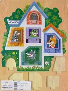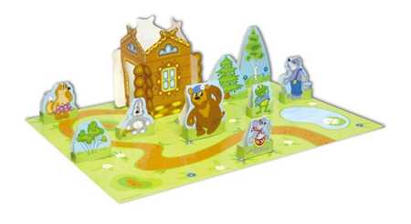 Красочное картонное игровое поле скрывает секретики: окошки, двери открываются, а за ними кто-то прячется - зайчик, волк, медведь. За каждым кустиком, деревом или грибочком, за облаком, дымоходом и под крышей кто-то сидит.